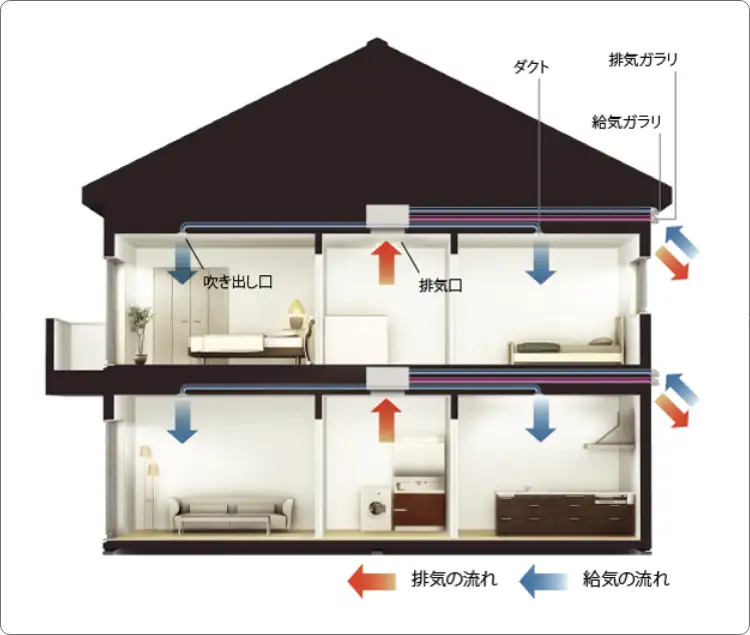 クレバリーホームの全熱交換型24時間換気システムは、花粉やウィルスはもちろんPM2.5など屋外から侵入する有害物質を除去する高性能な給気フィルターを標準搭載。また、窒素酸化物を効果的に除去するNOxフィルターもオプションでご用意しています。