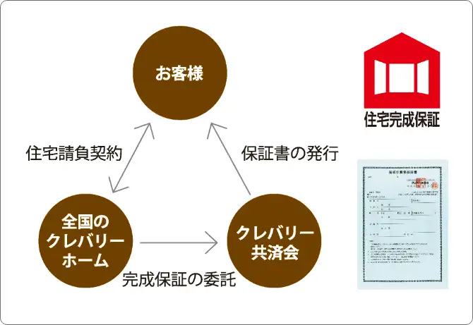 住宅完成引渡保証制度クレバリーホームFCでは、家づくりのご契約から完成まで保証する「住宅完成引渡保証制度※1」を実施。万一不測の事態が発生し、ご契約いただいた加盟店が工事を継続できなくなった場合でも、〈クレバリー共済会※2〉が責任をもって家を確実に完成させ、お引き渡しいたします。