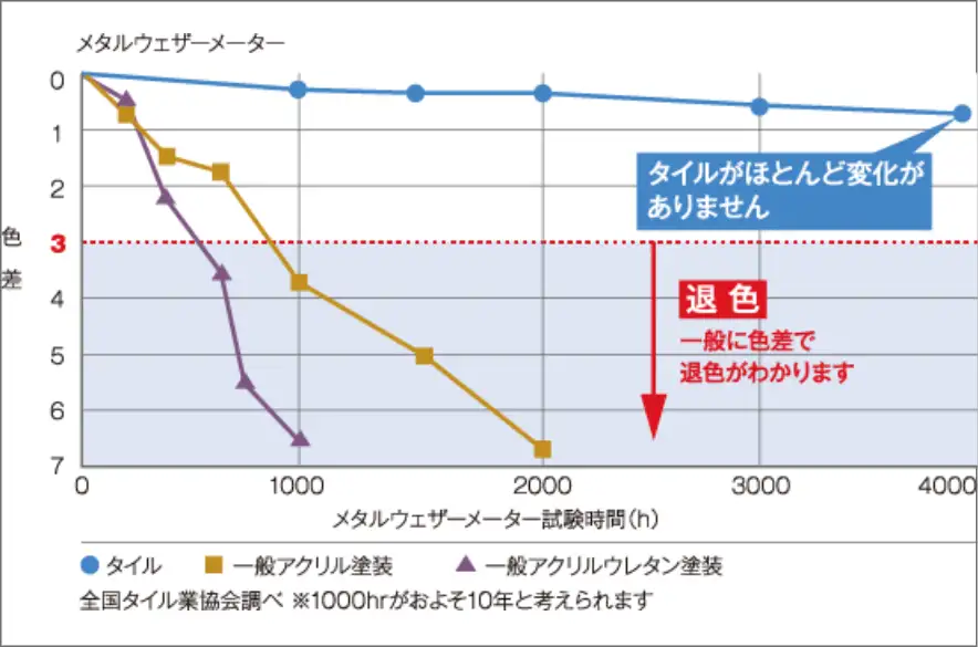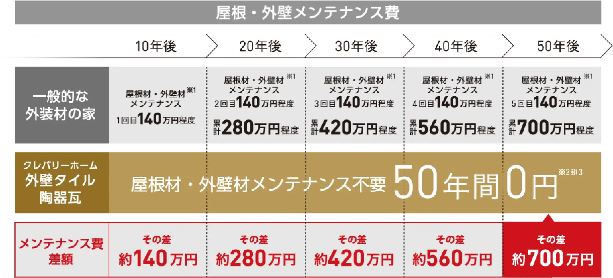 窯業系サイディングなど一般的な外壁材の場合、10年程度で塗り替えが必要となります。たとえ新築時の初期費用が多少かかったとしても、メンテナンス性に優れた外壁タイル、陶器瓦なら、長期的には断然お得です。